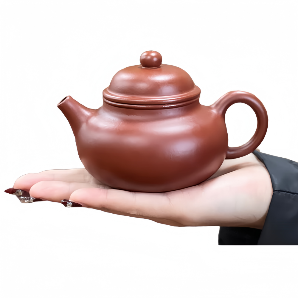A classic Yixing teapot made from Zhuni clay, featuring a smooth rounded body and steady pour for daily Gongfu tea brewing.