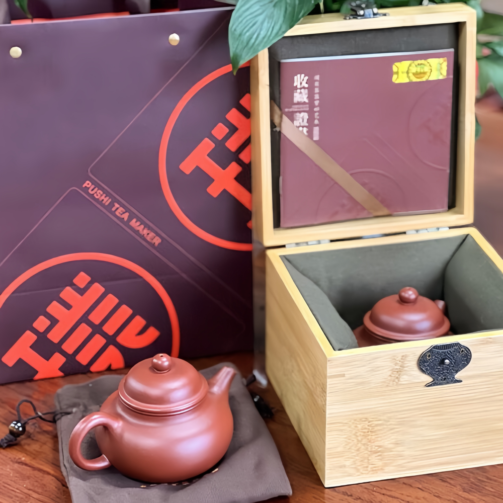 Each teapot follows traditional Yixing techniques guided by artisan Zhang Qiang, whose work combines careful shaping and polishing to highlight the clay’s natural character. The teapot is presented in a protective wooden gift box with a certificate card and cloth bag—ideal for storage or gifting.