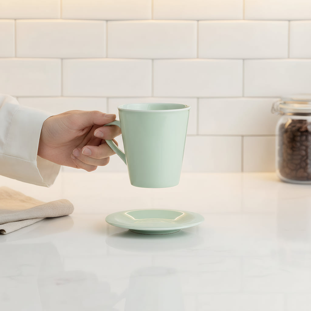 Celadon porcelain cup with tray — durable, refined, and ideal for tea or coffee anywhere.