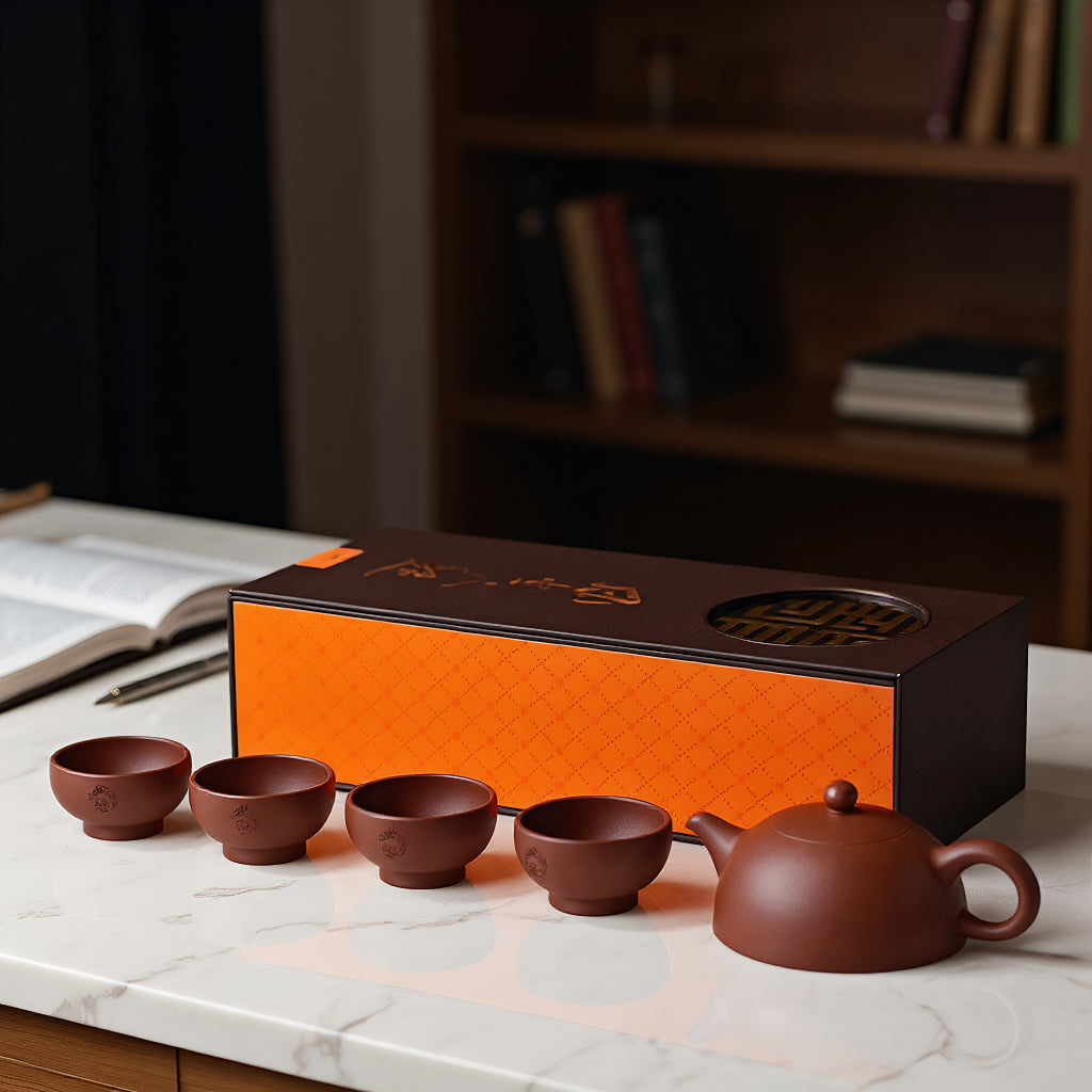 The Rising Fortune Yixing Tea Set embodies the harmony and prosperity of traditional Gongfu tea culture. Handcrafted by artisan Zhang Huan using fine Yixing Zhuni clay, this tea set includes a distinctive Half-Moon teapot and four matching cups.